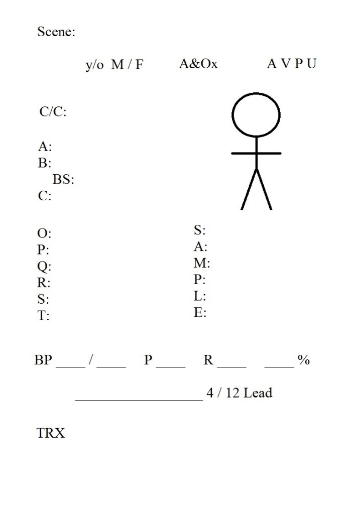 As I talked about in a previous post, I am a firm believer that the paramedic should have little to no physical contact with the patient if at all possible (depending on staffing, skill levels, etc.). If you have no clue what I’m talking about, please read my post titled “Running an Organized Cardiac Arrest”. Anyway, on scene I am typically standing away from the patient, delegating my crew to perform the required interventions, documenting what is taking place on scene, as well as recording any pertinent patient information. Organization is key here. I follow a template that has floated around the EMS community for a few years now, that I have tailored to my own needs. I have memorized the layout of this template and keep a small notebook in my pocket to write down all of the information needed.