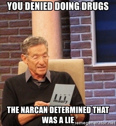 Well, we already said respiratory depression/failure, but there is also the finding of “pin point pupils” and the more obvious drug paraphernalia. So what if you’re unsure if they took an opiate, over some other drug substance? Or what if they mixed substances?