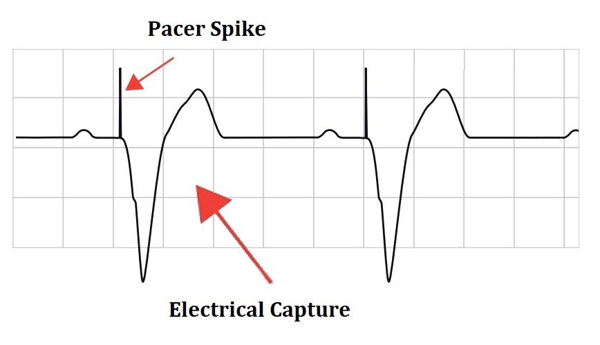 If the patient is still bradycardic, then you need to move on to transcutaneous pacing. You do this by placing defibrillation pads on the patient. If the patient is “stable-ish” you should consider a sedation drip for comfort. Pacing isn’t going to be the worst pain ever, but it won’t be enjoyable either. The patient will experience the equivalent of when someone rubs their feet on carpet and then shocks you when they come into contact with your skin. The only difference is, they will get this little jolt at the rate you set your monitor to. You will turn your monitor into “pacing” mode and set your rate (typically 60-70bpm). At this point you will slowly increase the voltage, mAh in this case, until you get what’s called “Electrical Capture.” Capture is when you have a QRS segment after every pacer spike on the monitor. At this point, AHA suggests decreasing the mAh until you lose capture and then increase by 10%. The reason for doing this is to deliver the least amount of electricity as possible. After you have achieved the required amount of energy to get capture, you need to assess your patient (i.e. vital signs).