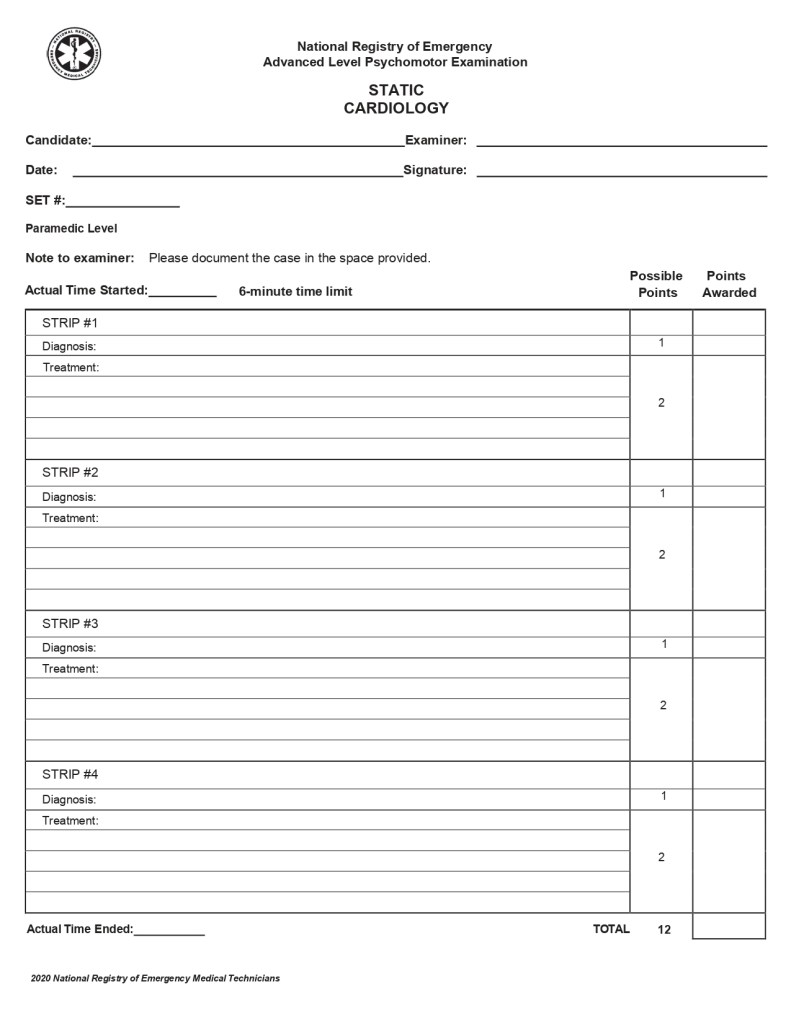 - For this station you will be given ECG rhythms. You will need to identify the rhythm and then state your treatment. Long story short, is the rhythm too fast, too slow, or not enough (cardiac arrest). You will follow the American Heart Association’s Advanced Cardiac Life Support algorithms for each of the four strips that includes: Tachycardia, Bradycardia and Cardiac Arrest. There are no listed “critical fails” for this scenario; however, you do need to identify and treat each patient appropriately within the six minute time limit.