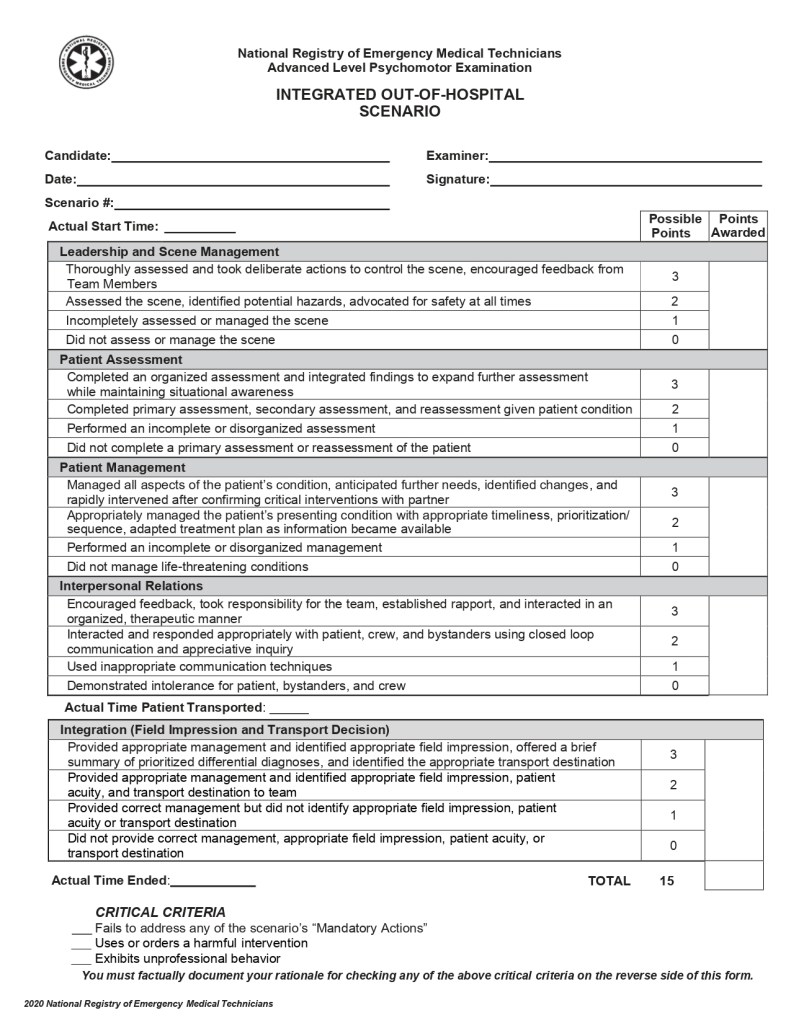 - This one is similar to your medical assessment, but obviously it’s a trauma call (similar to your EMT/AEMT psychomotor skill station, just with more advanced scope of practice). They’re more than likely won’t be a multi-trauma incident. Make sure you splint/stabilize as needed and get them to the hospital. The big thing here is C-Spine. If there is ANY chance of spinal injury, then just take C-Spine precautions. You can’t lose points for taking C-Spine and back-boarding, so if you’re worried about it, then just do it.