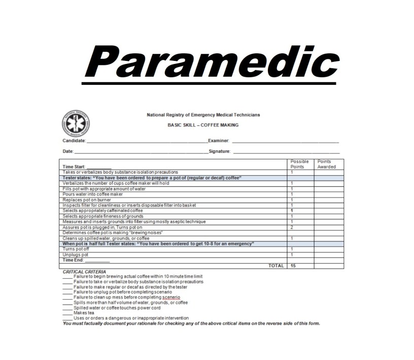 - This is the fun one… (said no one ever). The out-of-hospital scenario is the scenario that your entire medic school has lead up to. Throughout the paramedic program your instructor has kept a file on all of the skills you have practiced throughout the program. This file is what is known as your “Paramedic Student Portfolio.” This portfolio serves as proof that you were not only trained on every skill, but that you have routinely practiced each skill in accordance with the program requirements. All of these skills are then pulled into this scenario. So instead of testing every skill station as you do for EMT/AEMT, now you are tested on one scenario where a random selection of these skills will be needed. For instance, if you get a motor vehicle collision then you will most likely be required to perform C-Spine, supine spinal immobilization, IV access, and pain management medication administration as needed for the patient. These scenarios are randomized and the skills required change from scenario to scenario. The scenario starts with dispatch information. You will need to request any additional resources and act just like you are running a real call. You will have a partner assigned to you that can act out any skill you ask of them. For this skill, you can’t just say things like “I’ll get a set of vitals,” You will actually attach the patient to your cardiac monitor and take any vital signs that you would like. You will also perform any tasks that need to be completed. This could be anything from starting an IV, to splinting an injury, to intubating a patient. You will arrive on scene, assess, treat, and transport the patient as needed. The worst part of this scenario is the time frame of 20 minutes. Regardless of how long it takes to perform these tasks, you will use the entire 20 minutes. When I tested, I had a child with 3rd degree burns. I had a patient and a mother that I needed to keep calm for that full amount of time. After obtaining vital signs, obtaining IV access, doing the Parkland Formula to determine the fluid resuscitation needed and contacting medical control for 100mcg of Fentanyl, I had 15 minutes remaining. For the remainder of my scenario I had to sit in the “truck” with my patient and his mother. Now this may not seem like it is that big of a deal, but 15 minutes of simulated small-talk is SUPER awkward. For this scenario, I was not only graded on my treatment of the patient, but also on keeping the patient and his mother calm and treating accordingly. Like all of the other skill stations, practice makes perfect!